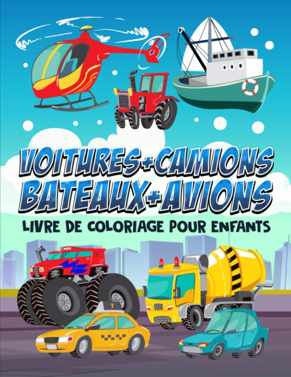 Voitures + Camions + Bateaux + Avions : Livre de coloriage pour enfants: 35 illustrations mignones pour les petits 3 à 10 ans